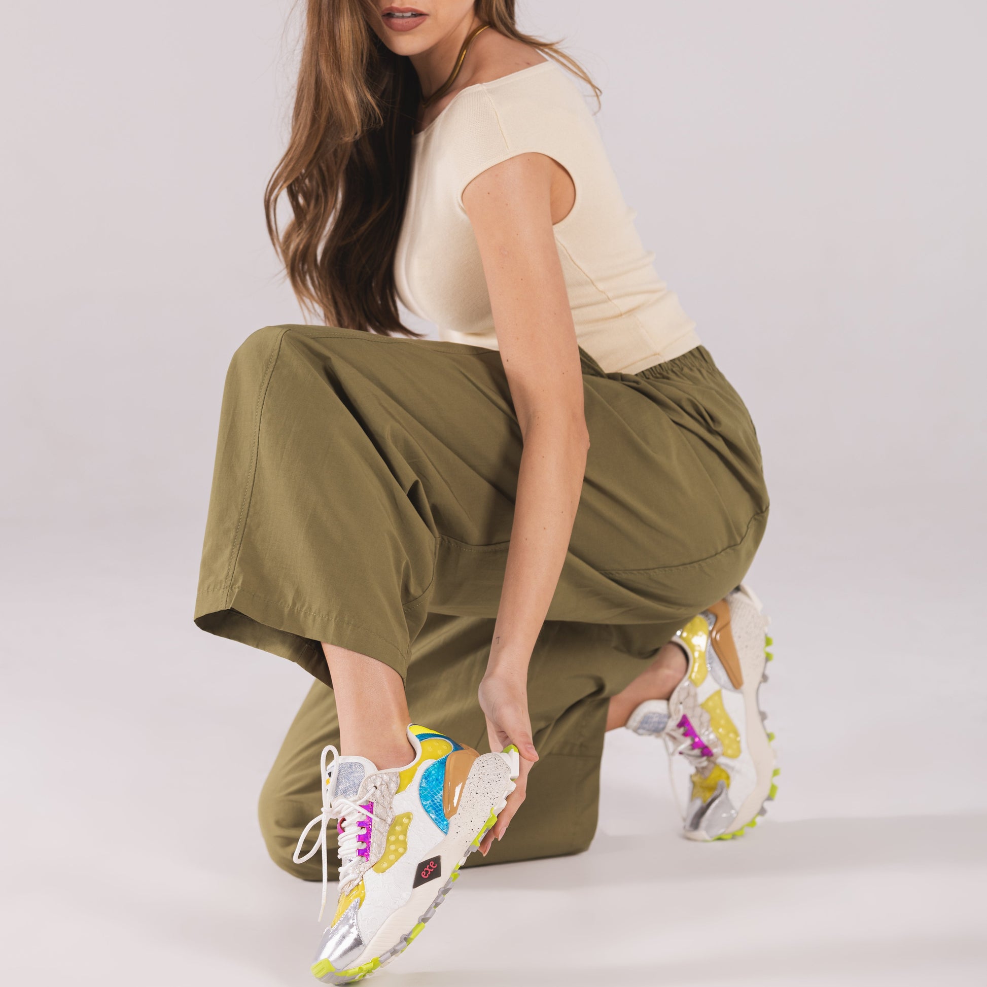 Sapatilha com design moderno e ar irreverente, em tons claros com apontamentos vibrantes em verde, azul e rosa para um visual fresco e atual. A sola em borracha de 4,5 cm, com relevo antiderrapante, garante conforto, estabilidade e bom amortecimento no dia a dia. Interior almofadado e palmilha acolchoada para maior bem-estar ao longo do uso.