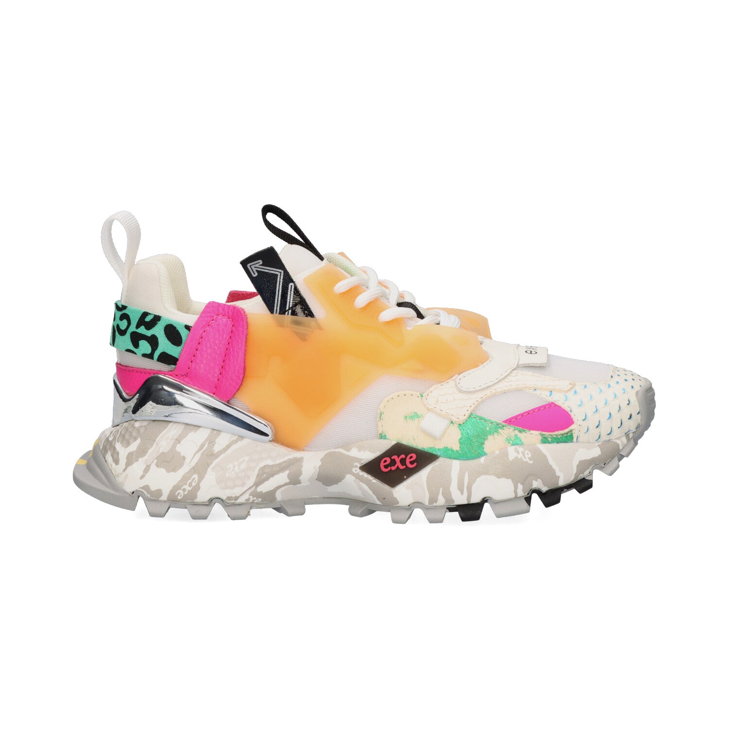Sapatilha com design urbano e ousado, combinando tons claros com apontamentos vibrantes em laranja, rosa e verde para um visual irreverente e cheio de atitude. A sola em borracha de 4,5 cm, com relevo antiderrapante, garante conforto, estabilidade e bom amortecimento no dia a dia. Interior almofadado e palmilha acolchoada para maior bem-estar ao longo do uso.