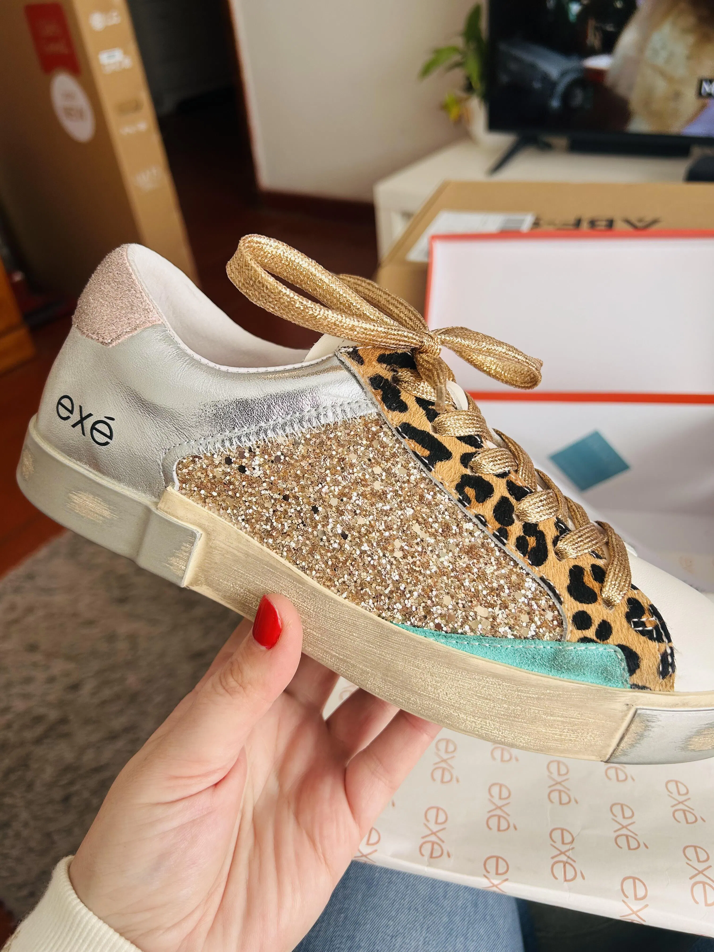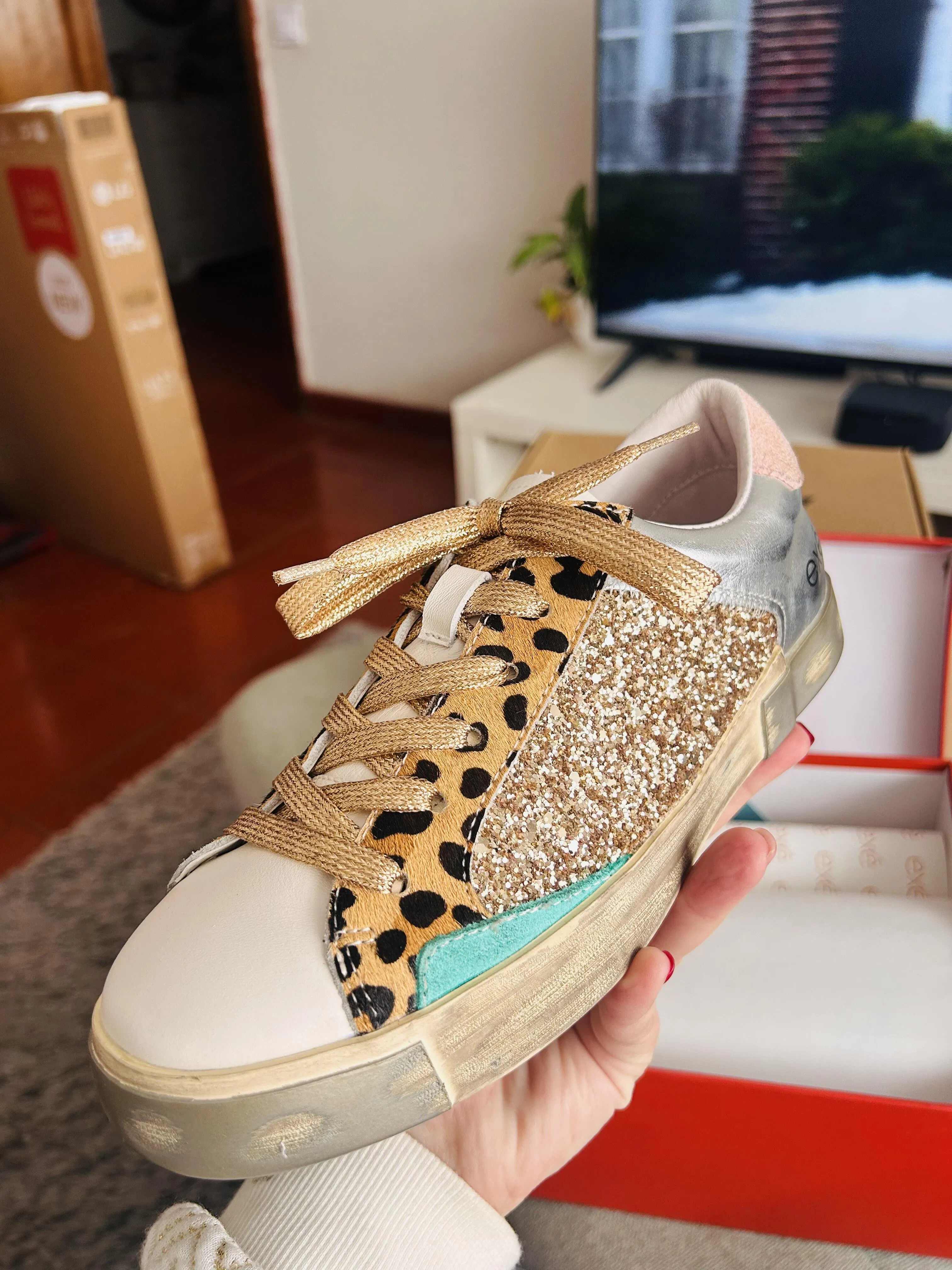 Ténis de pele e glitter multicolor sola de borracha. Forro e palmilha em pele.