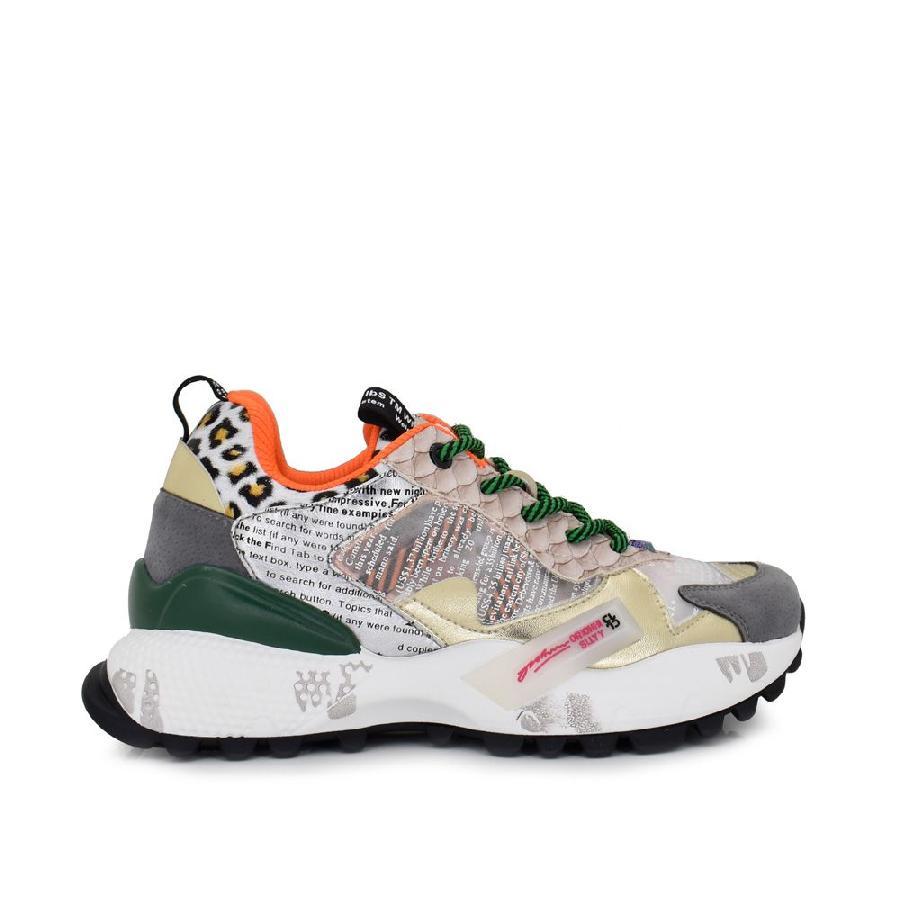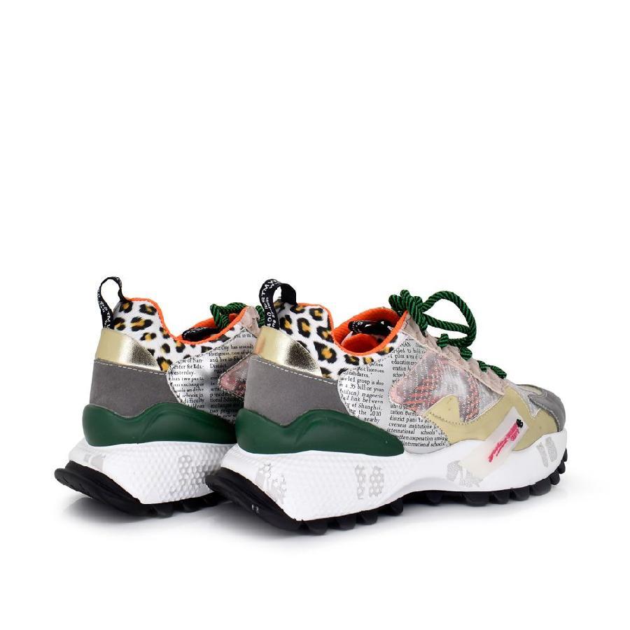 Ténis em material sintético multicolor elaborado com vários materiais. Sola de Borracha