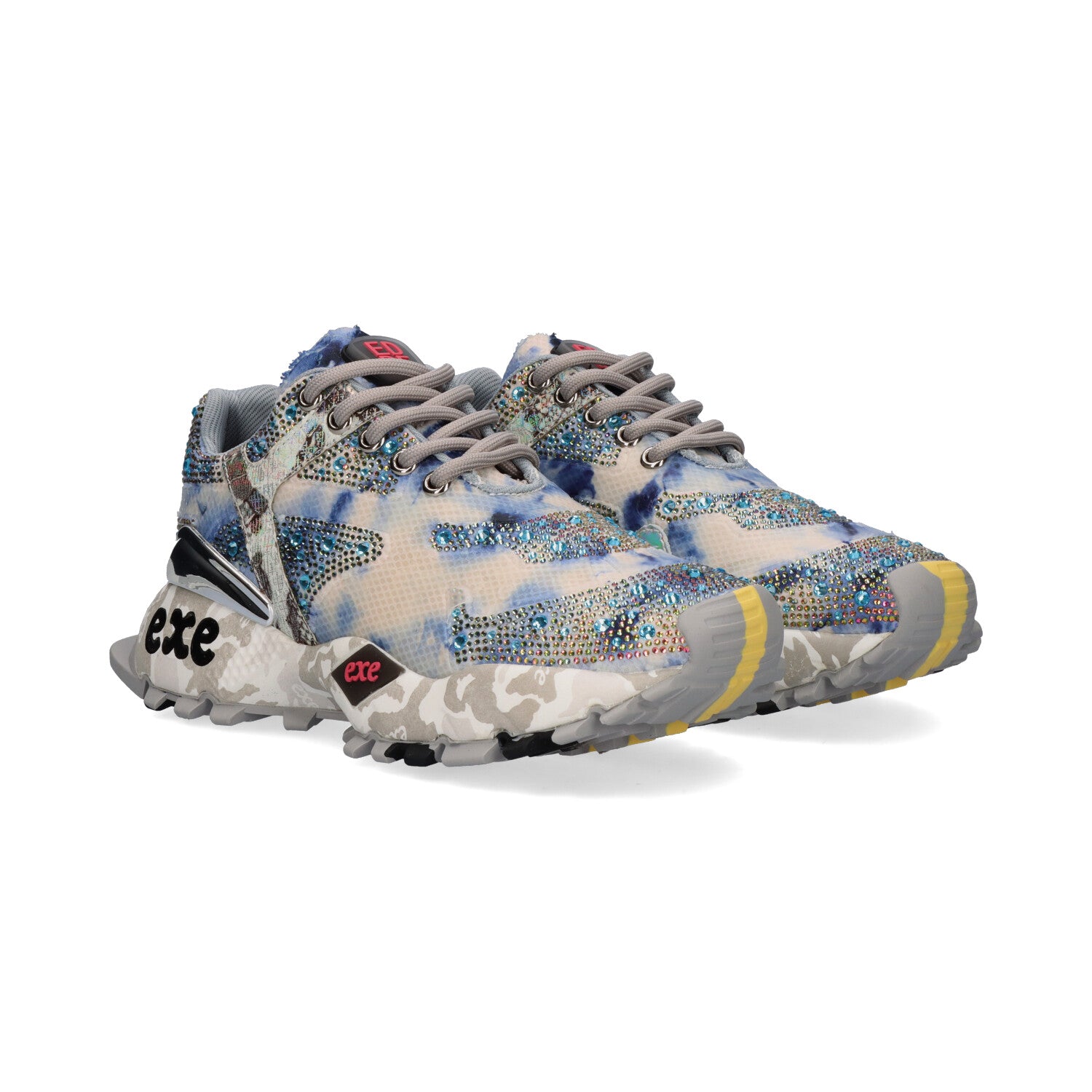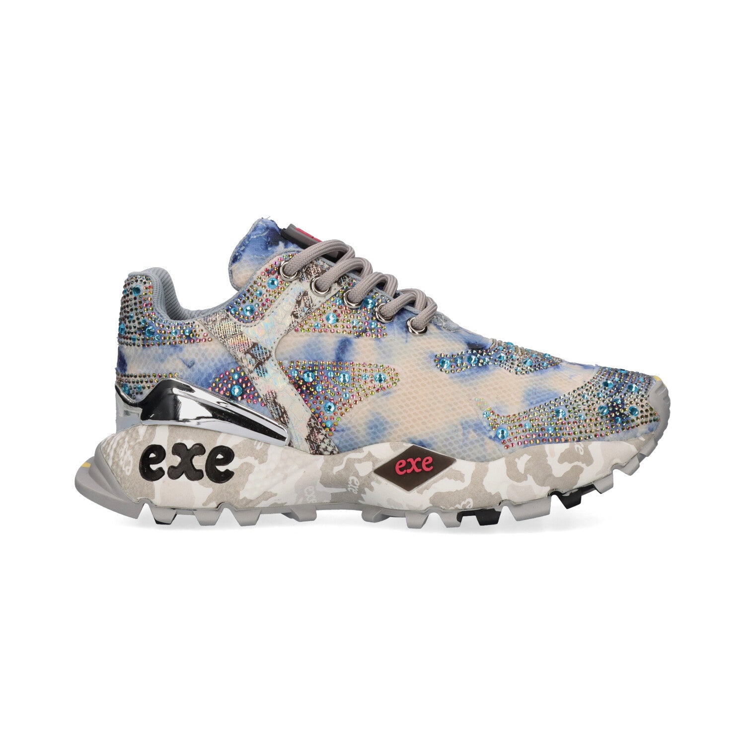 Sapatilha com design contemporâneo e cheio de personalidade, em tons claros com apontamentos azulados e detalhes decorativos brilhantes que criam um visual marcante e atual. A sola em borracha de 4,5 cm, com relevo antiderrapante, assegura conforto, estabilidade e bom amortecimento no dia a dia. Interior almofadado e palmilha acolchoada para maior bem-estar ao longo do uso.