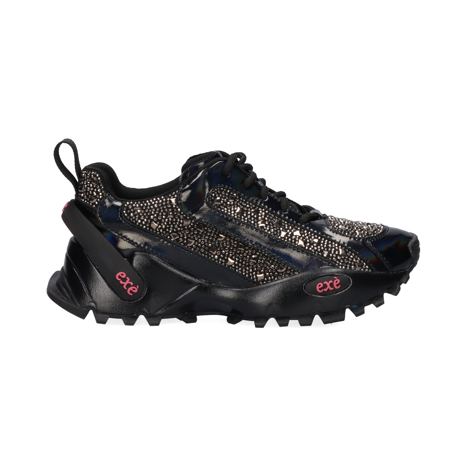 Sapatilha com design moderno e sofisticado, em tom preto com acabamento brilhante e aplicações decorativas que conferem um toque elegante e marcante. A sola robusta em borracha com relevo antiderrapante garante conforto, estabilidade e bom amortecimento no uso diário. Interior almofadado e palmilha acolchoada para máximo bem-estar ao longo do dia.