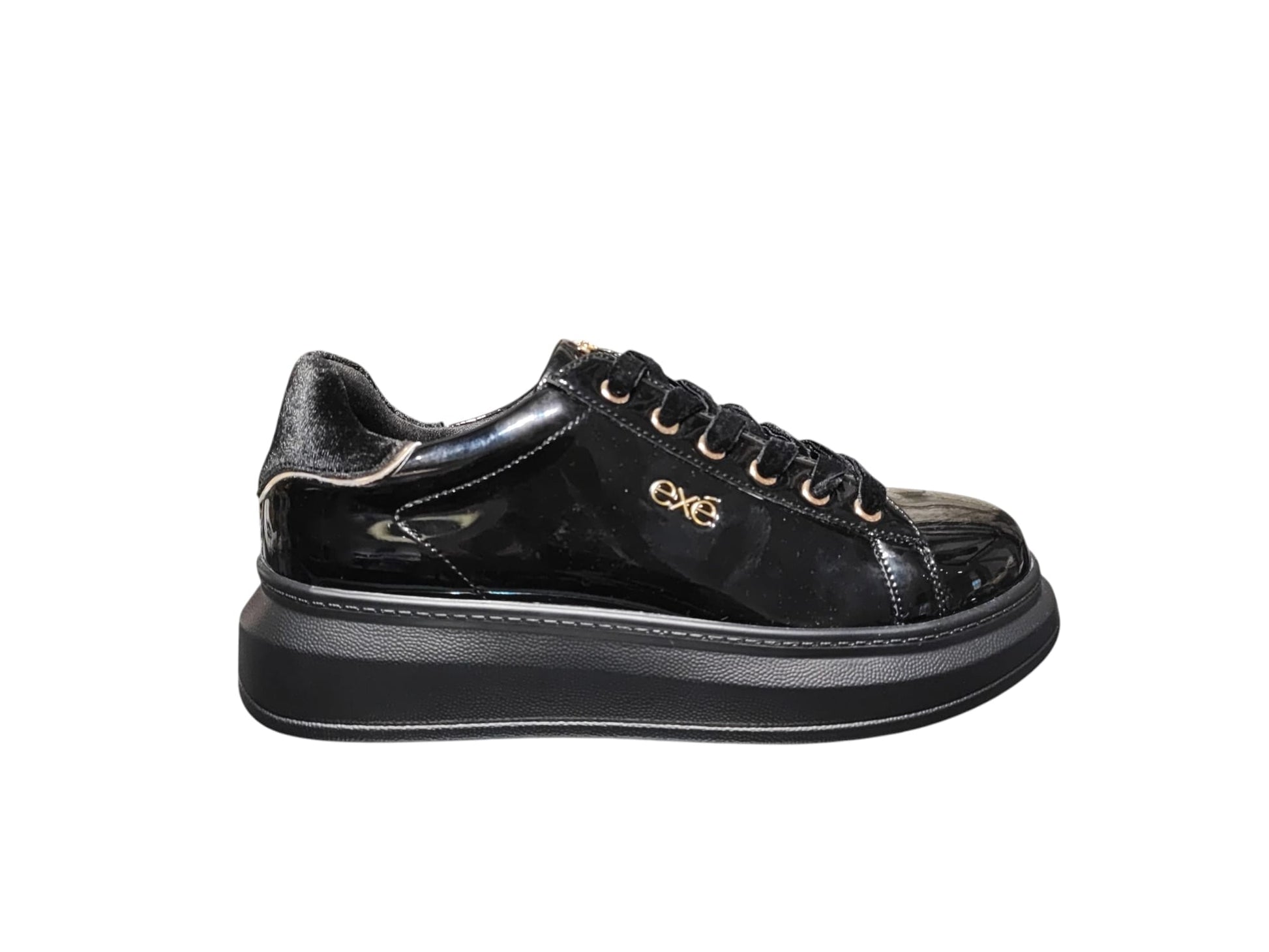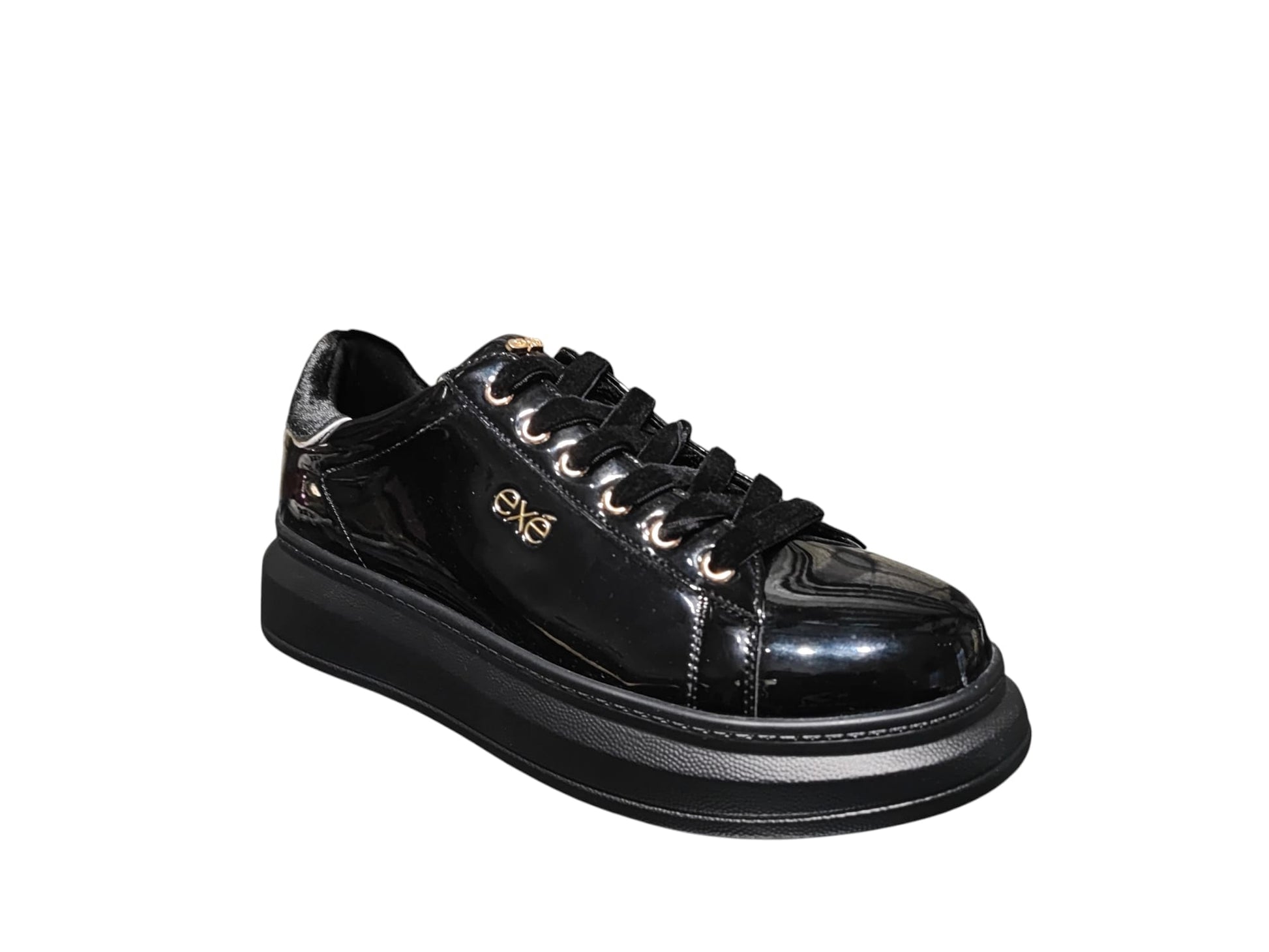 Ténis em verniz preto com aplicações douradas e cordões de veludo. Sola de Borracha
