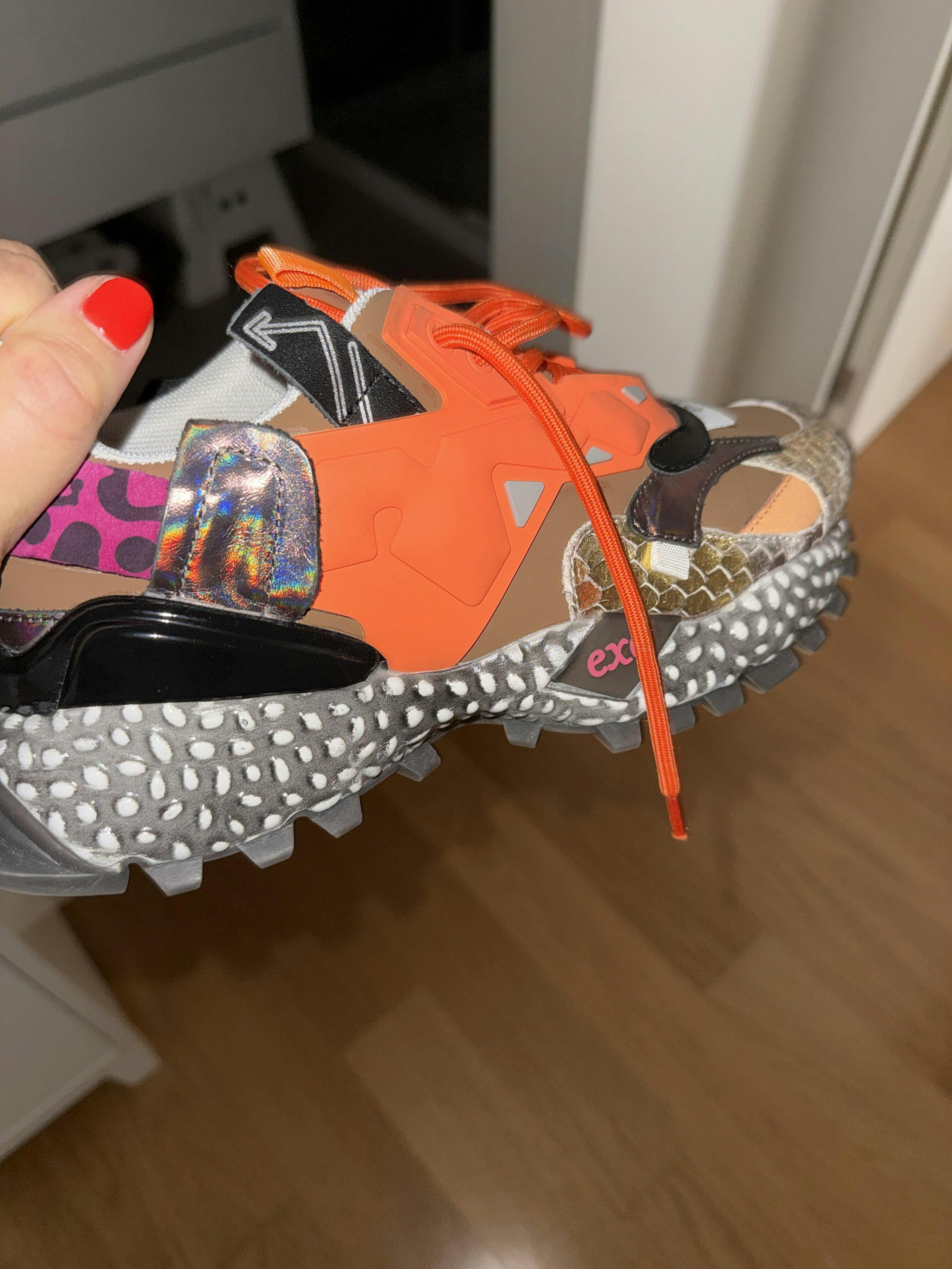 Ténis de pele e tecido multicolor com e sola de borracha. Forro em tecido e palmilha em pele.