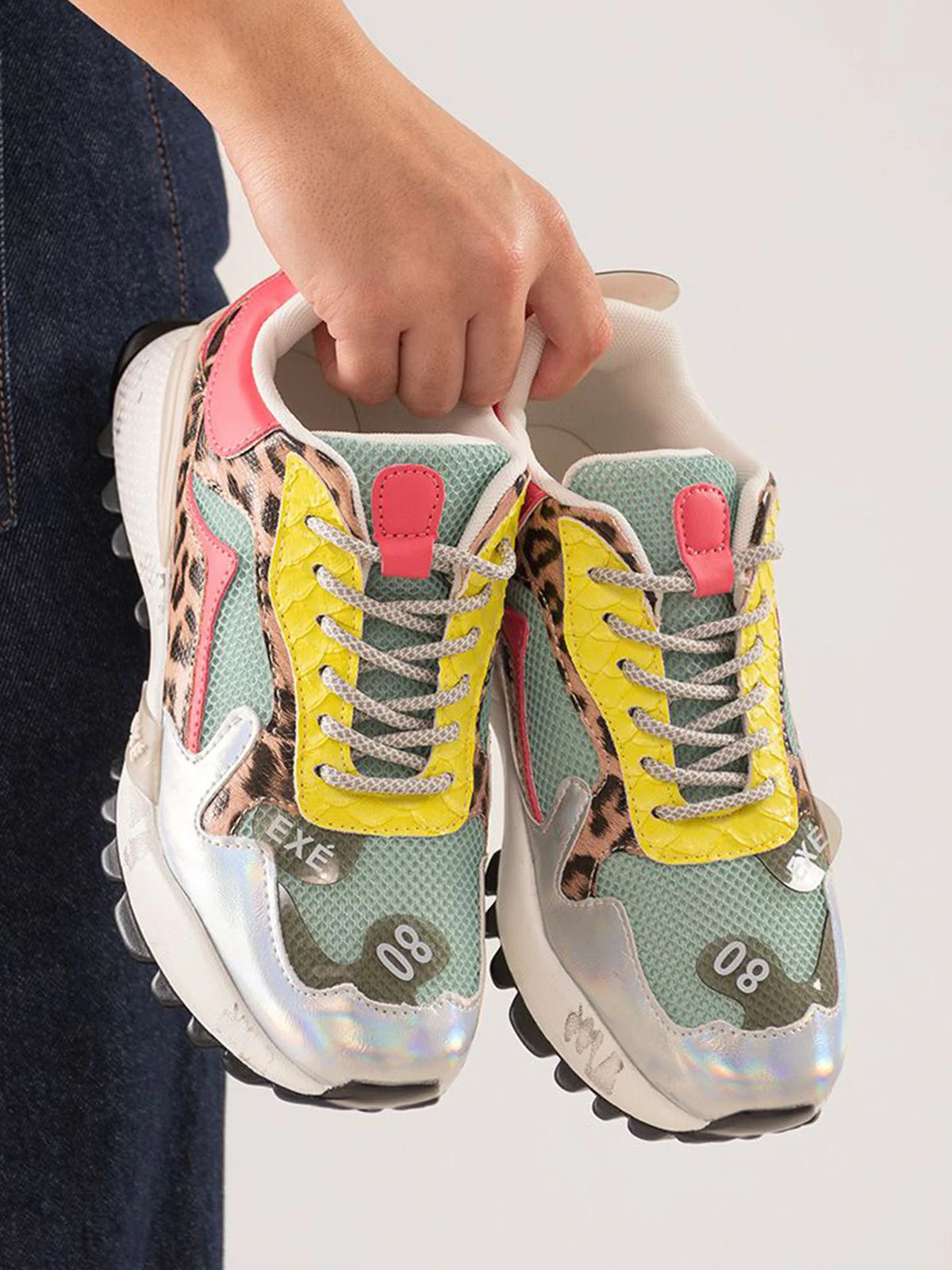 Ténis em material sintético multicolor elaborado com vários materiais. Sola de Borracha