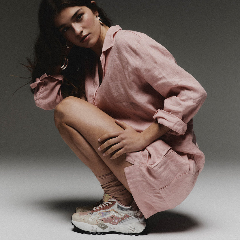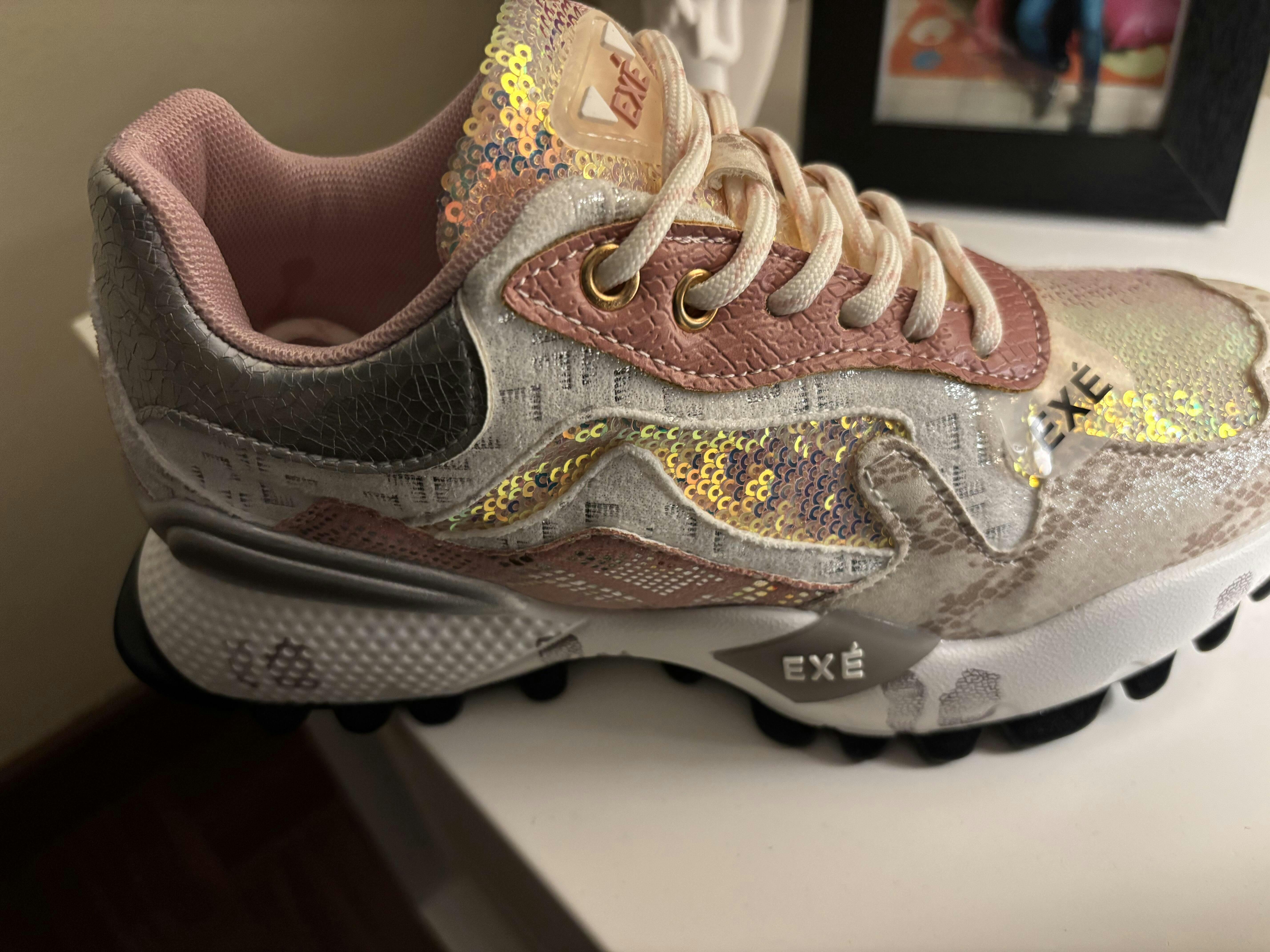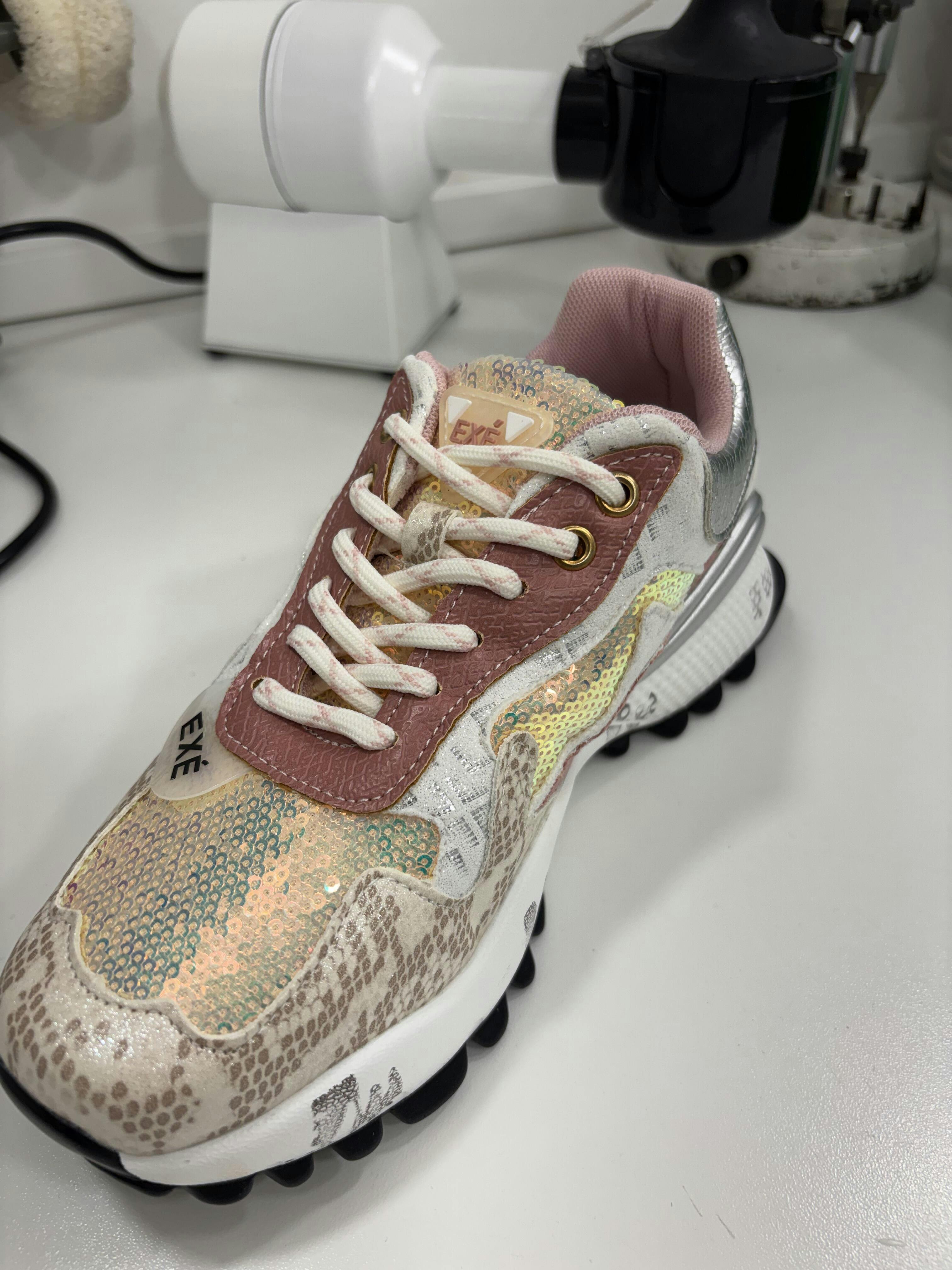As sapatilhas EXE D190608-13B WHITE/PINK destacam-se pela combinação de tons nude e rosa com detalhes metalizados, que conferem um toque moderno e sofisticado. A sola (com 4 cm atrás e 3 cm à frente ) robusta em borracha garante conforto e estabilidade ao longo do dia, enquanto o design urbano torna este modelo versátil e fácil de conjugar. Ideais para looks casuais cheios de estilo e personalidade.