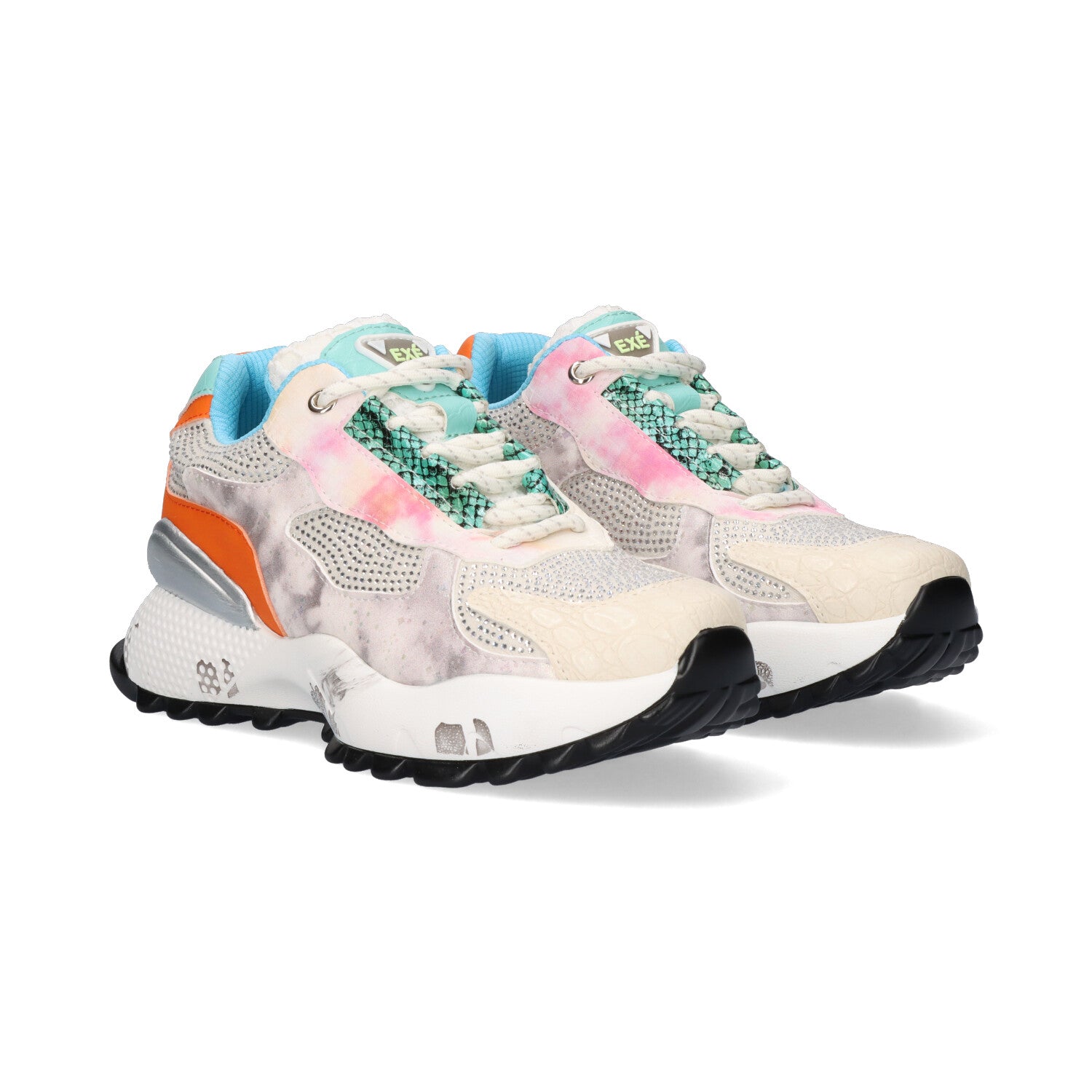 As sapatilhas EXE D190608-22 WHITE/ORANGE destacam-se pelo seu design arrojado e contemporâneo, onde a base em tons claros é realçada por apontamentos vibrantes em laranja e detalhes em azul-turquesa que conferem personalidade e frescura ao modelo. As aplicações de brilho subtis e as diferentes texturas criam um visual dinâmico e sofisticado, perfeito para quem gosta de marcar a diferença. A sola em borracha, com aproximadamente 4 cm de altura atrás e 3 cm à frente, garante estabilidade, conforto e excelente amortecimento ao longo do dia, aliando moda e funcionalidade num só modelo.