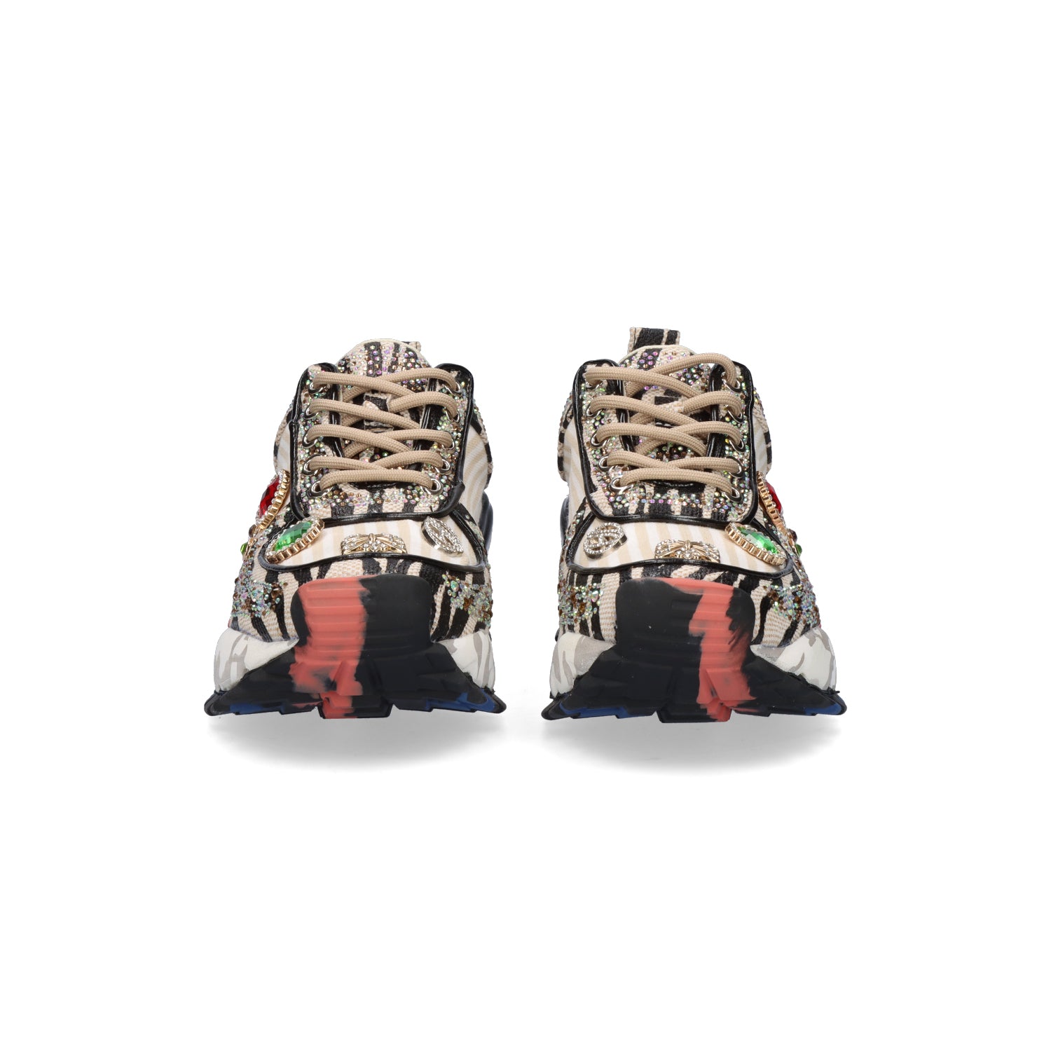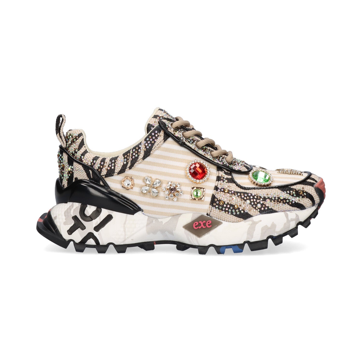 Ténis de pele e tecido multicolor com brilhantes e sola de borracha. Forro em tecido e palmilha em pele.