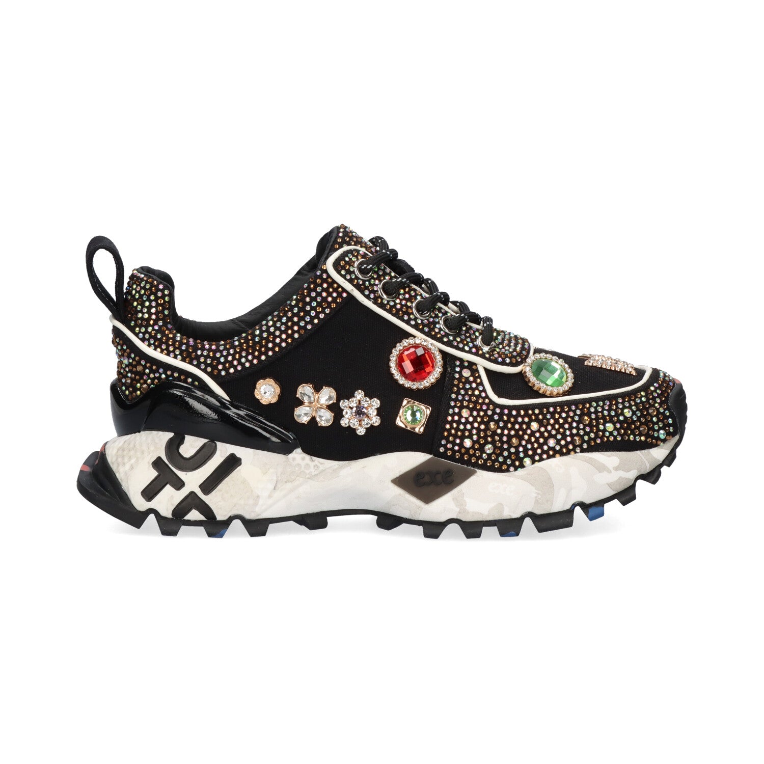 Ténis de pele e tecido multicolor com brilhantes e sola de borracha. Forro em tecido e palmilha em pele.