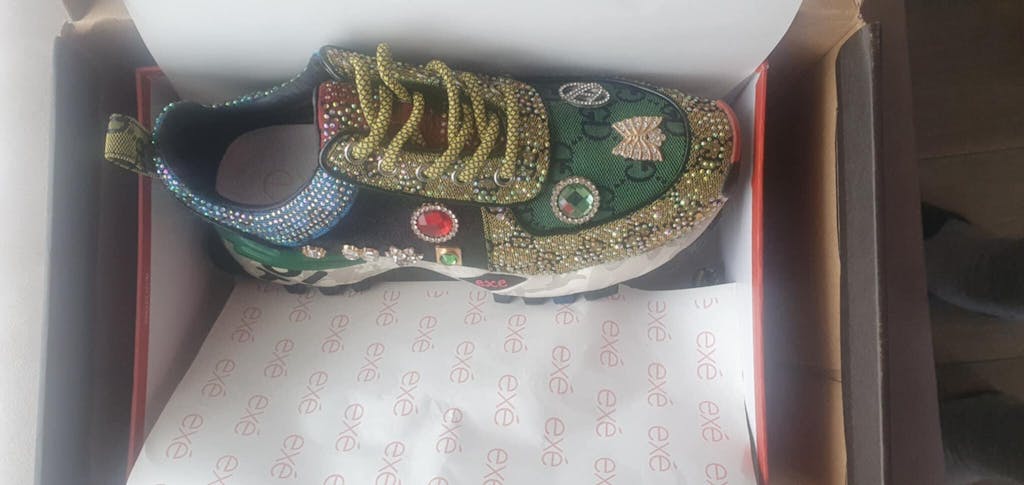 Ténis de pele e tecido multicolor com brilhantes e sola de borracha. Forro em tecido e palmilha em pele.