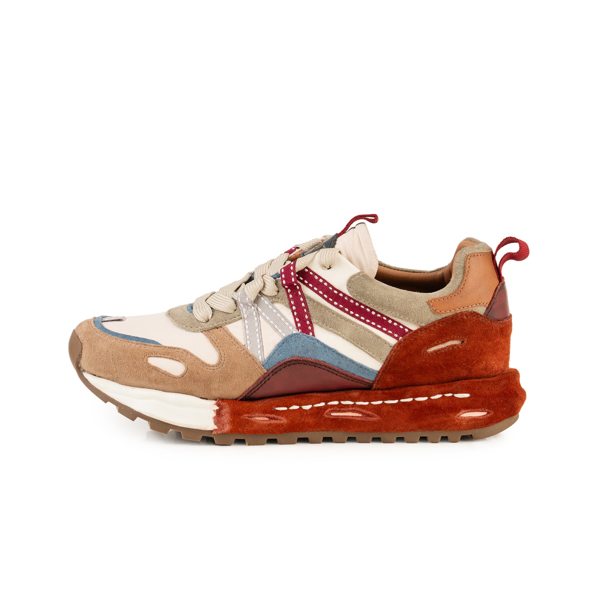 Estes ABF-97 destacam-se pela fusão de pele genuína e camurça em tons de bege, vermelho e azul, criando um estilo contemporâneo e arrojado. O interior em pele proporciona conforto superior, enquanto a sola em borracha pintada garante aderência e durabilidade. Um modelo versátil e distinto, ideal para quem procura exclusividade e autenticidade.