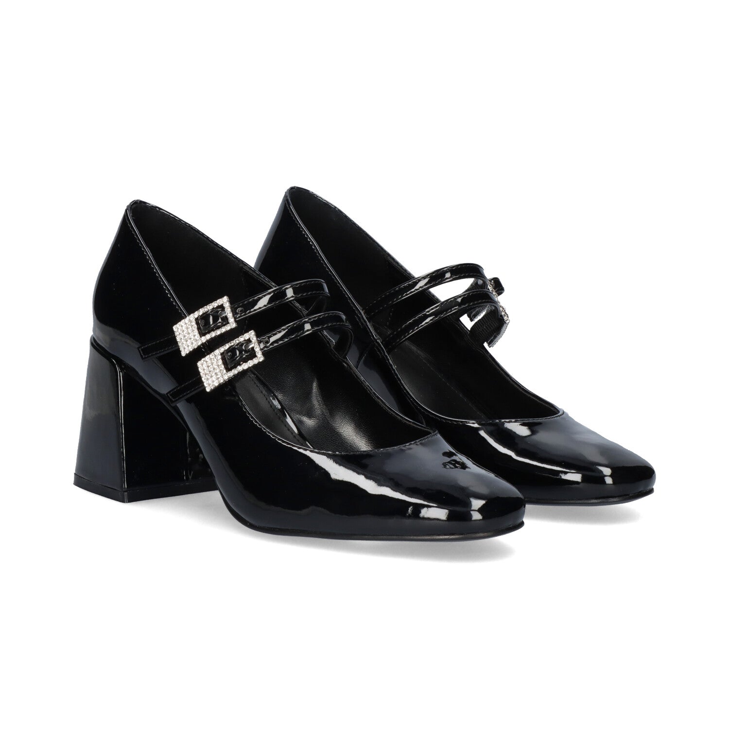 Sabrina em preto preto com duas tiras . Palmilha e forro em pele. Salto com altura de 7 cm.